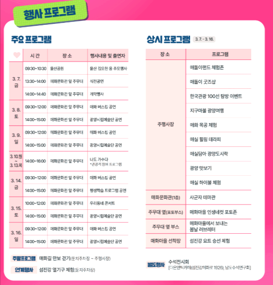 이번 축제는 단순히 매화꽃을 구경하는 것뿐만 아니라, 다양한 체험 프로그램이 준비되어 있어요!