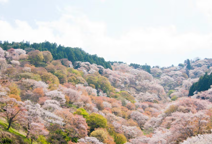요시노산은 유네스코 세계 문화 유산으로 지정된 곳으로, 3만 그루의 벚나무가 산을 뒤덮고 있습니다. 4월 초에서 중순까지가 절정이며, 산책하며 자연을 만끽할 수 있습니다.
