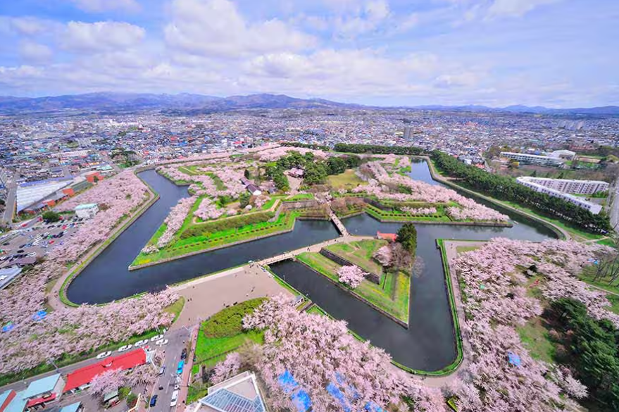 🌸 특징: 별 모양 요새에 펼쳐지는 1,600그루의 벚꽃
