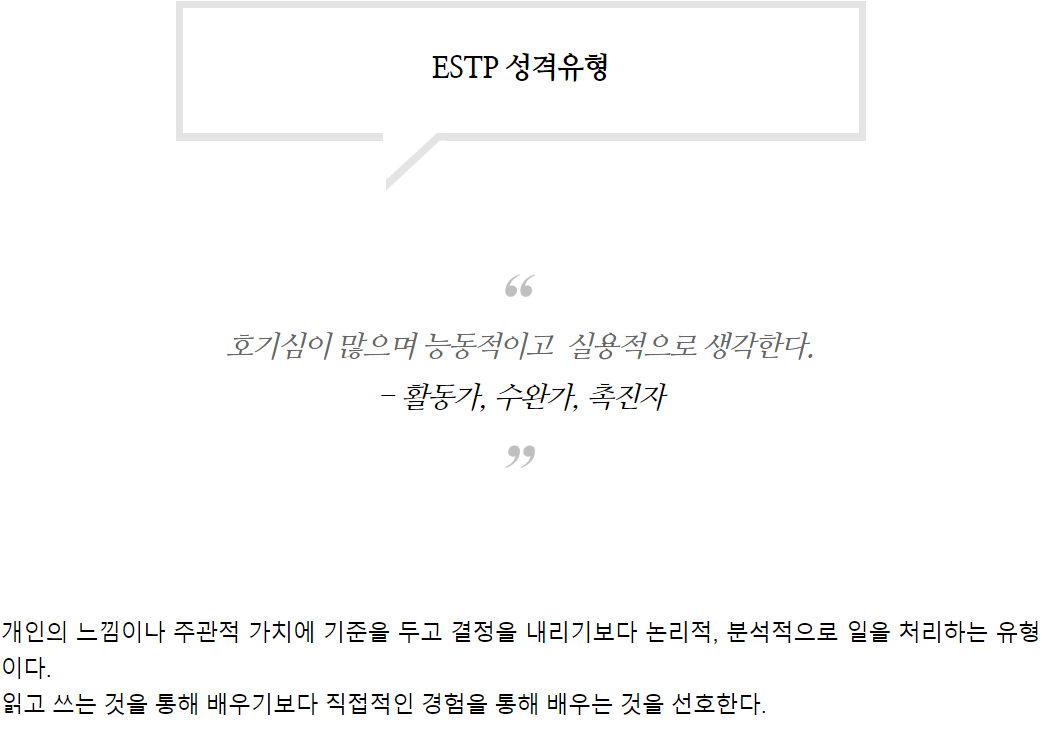 ISTJ유형(집중력이 강하고 진지하며 책임감이 강하다. - 절약가, 보수파, 준법자)이 25%에 달한다.