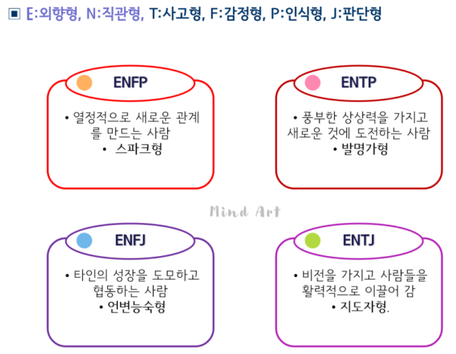각각 상반된 유형이 존재하며이를 조합하면 총 16가지의 성격 유형이 나온다.1. 에너지 방향 - 외향(E) & 내향(I)