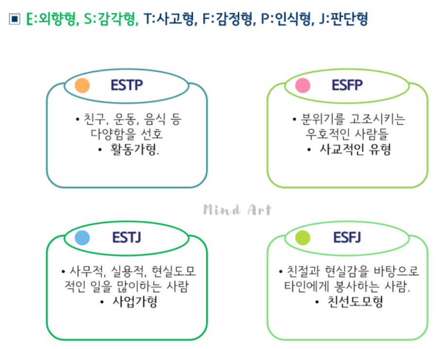 MBTI는 에너지 방향, 인식 기능, 판단 기능, 생활양식 이렇게 4 가지로 분류된다.