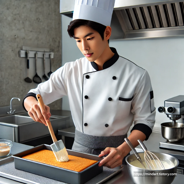 (케이크 반죽이 고르게 퍼졌는지 확인해!)