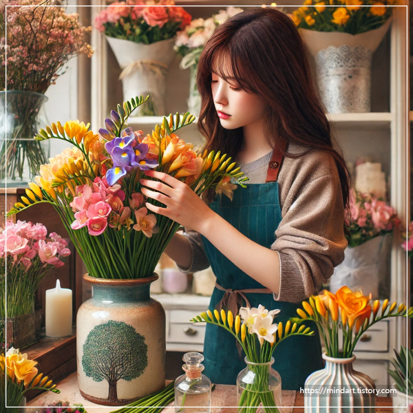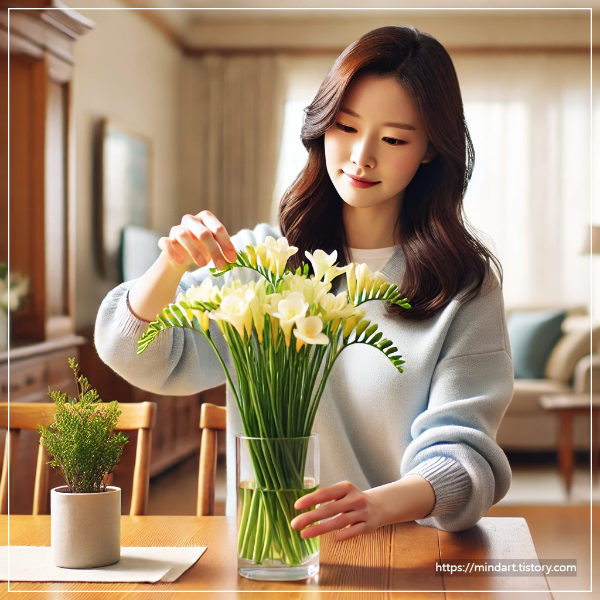 - 인테리어 소품: 프리지아 꽃다발이나 화분은 집안 분위기를 화사하게 만들어줘요.