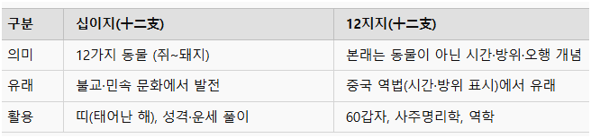 📌 즉, 12지지는 본래 동물이 아닌 기호였지만, 후대에 십이지(동물 개념)가 붙어 더 널리 쓰이게 된 거예요!