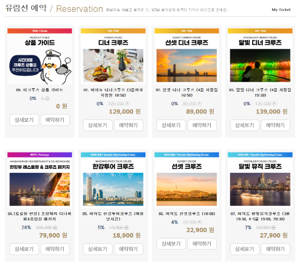언어 한국어 English 유람선 예약 / Reservation 매일매일 새롭고 즐거운 곳, 365일 즐거움과 행복이 가득한 한강으로 오세요! My Ticket