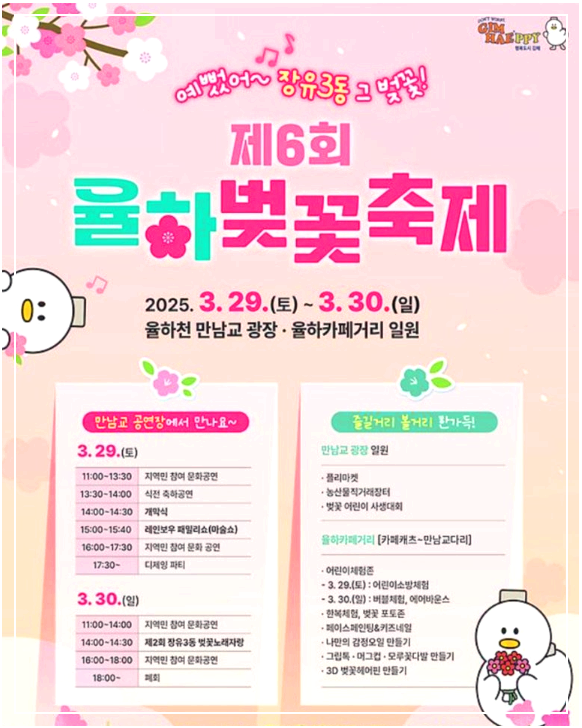 이 축제는 김해시 장유 3동 주민자치회가 주관하며, 율하천을 따라 만개한 벚꽃과 함께 다양한 문화행사와 율하 카페거리를 즐길 수 있는 봄철 대표 축제랍니다. 🌸🏞️